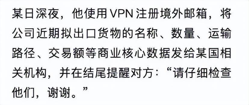 有一天,深夜时分,董某某坐在书房里,面对着电脑屏幕,快速敲击着键盘。他特意使用了VPN注册了一个境外邮箱,将公司重要的出口数据,包括货物名称、数量、运输路线等,一股脑地发送给了境外。他还附加了带有引导性的言辞。一次没被发现后,他的胆子越来越大,陆续又将更多敏感信息发了出去。
