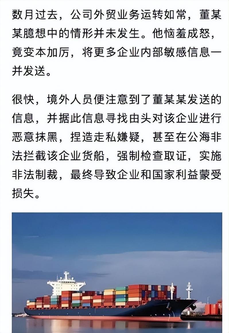 这次泄密行为很快带来了严重后果:境外的某机构抓住机会,拦截了公司的一艘货船,并强制登船检查,船上的货物全被扣留。公司因此损失了数千万,合作伙伴也纷纷暂停了合作,甚至国家的国际形象也受到了影响。直到国安人员上门,董某某才彻底慌了,他不断重复说“我没想到会这样”。但后悔已经晚了,董某某因涉嫌侵犯商业秘密和为境外非法提供情报,被依法追诉,最严重的后果可能面临无期徒刑。