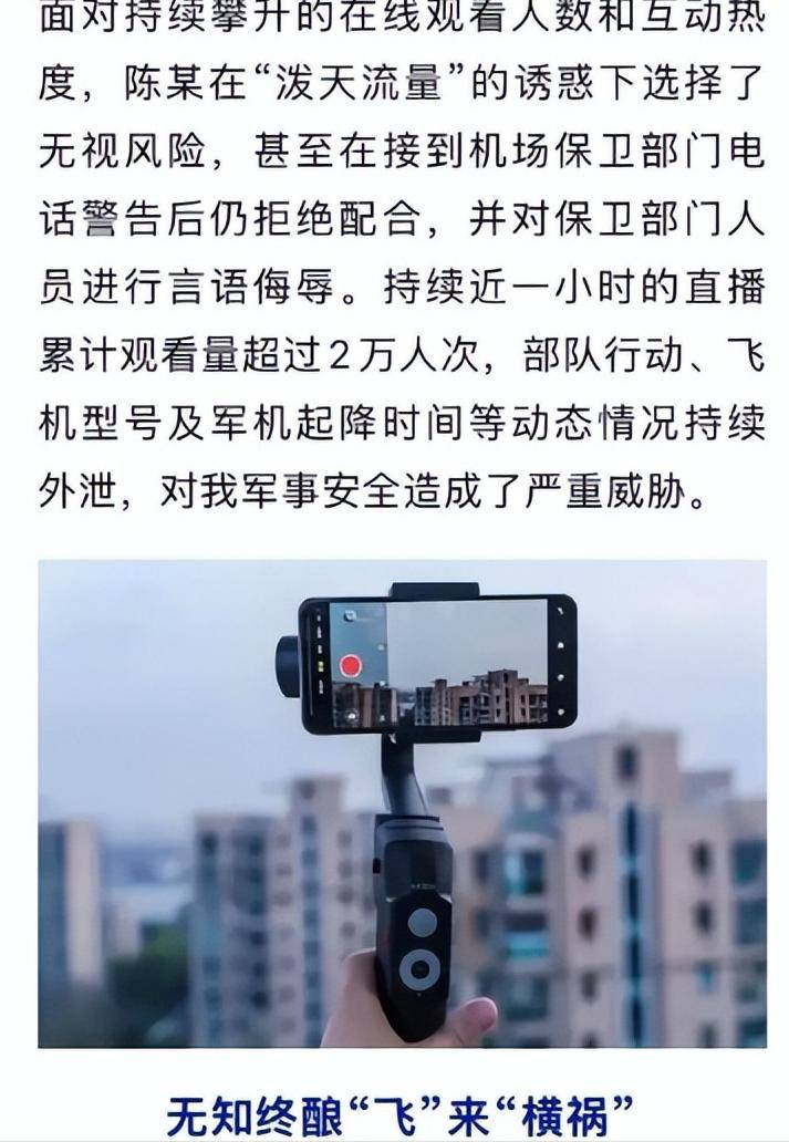 某天晚上,陈某听到外面军机的轰鸣声,出于好奇,他打开手机,开始直播,想借着“军机”吸引一些关注。直播期间,观众纷纷提醒他:“这种内容不能播,会泄密!”甚至机场保卫部门也打电话警告他立即停止直播。可是,陈某不但没听,反而因为观看人数不断攀升,继续直播了近一个小时。这一小时里,军机的型号、行动时间等信息被暴露给了直播间的观众,其中不乏境外势力的眼线。最终,这一举动严重威胁了国家的军事安全,陈某也因此被依法抓获,涉嫌故意泄露军事秘密,可能面临五年以上的有期徒刑。