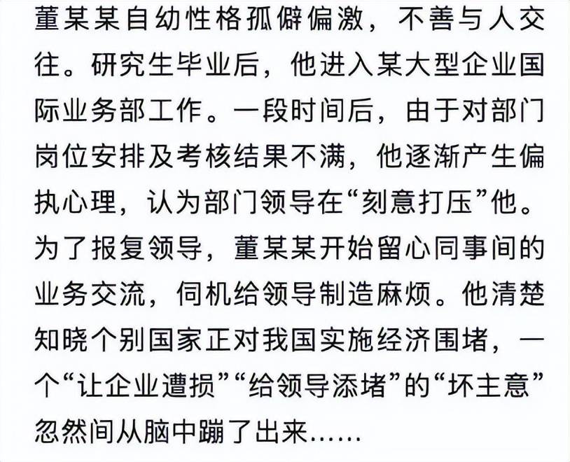 央视对此案件进行了专门报道,揭示了董某某走上这条道路的动机。原来,他是因为对工作调动和考核结果不满,才做出了这样的选择。几次头脑发热,竟将自己未来的前途葬送。然而,尽管他有着诸多不满,但也不能因此把国家和企业的利益当成发泄工具!