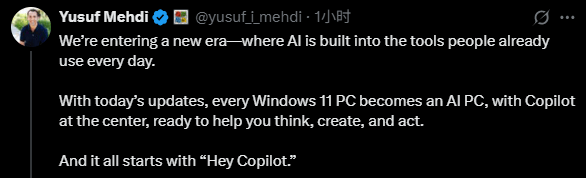 微软执行副总裁兼消费者首席营销官 Yusuf Mehdi 在社交平台 X 上写道,“我们正在进入一个新时代——人工智能已经融入到人们日常使用的工具中。”