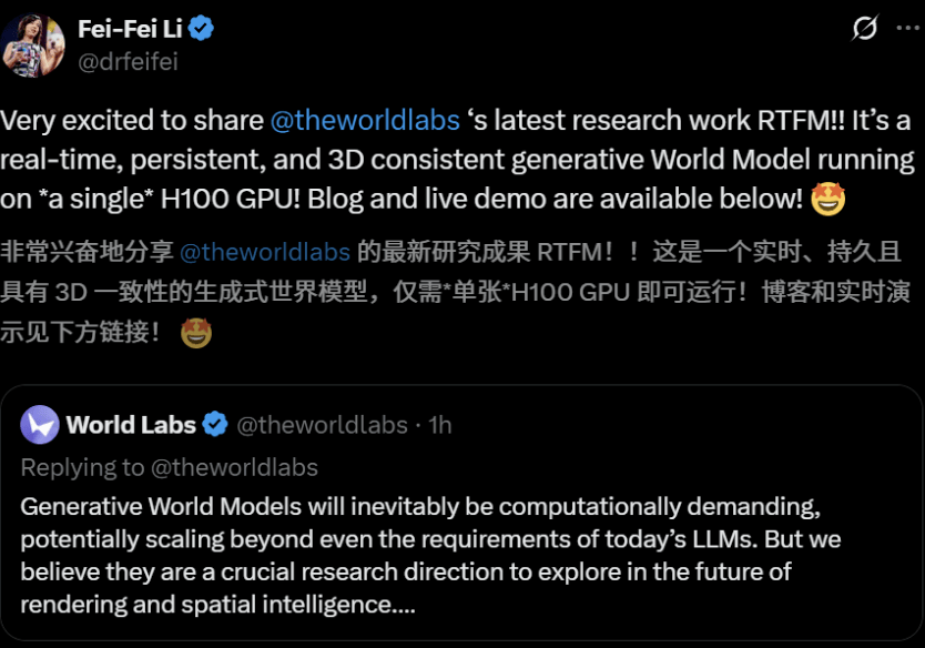 “AI 教母”斯坦福大学教授李飞飞创立的 World Labs 于 10 月 17 日发布实时生成式世界模型 RTFM。