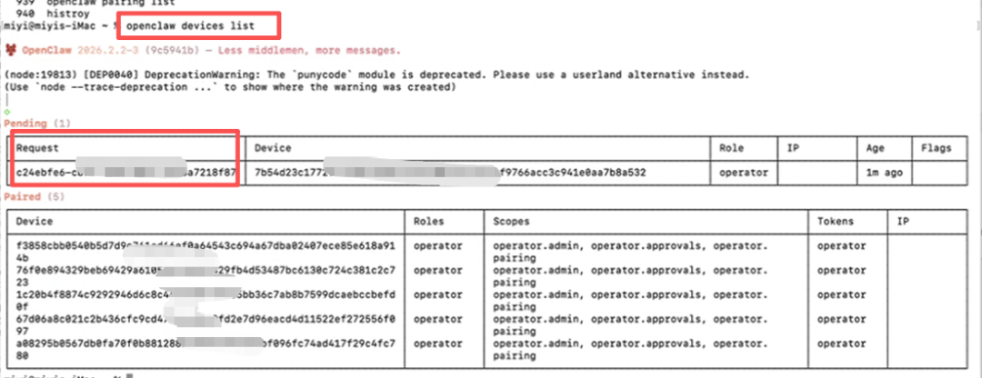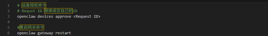 如果您使用一台新的设备去访问OpenClaw Gateway Dashboard的 URL时,除了需要配置上面的GateWay Token 之外,还需要对新的设备进行授权,否则会提示错误。