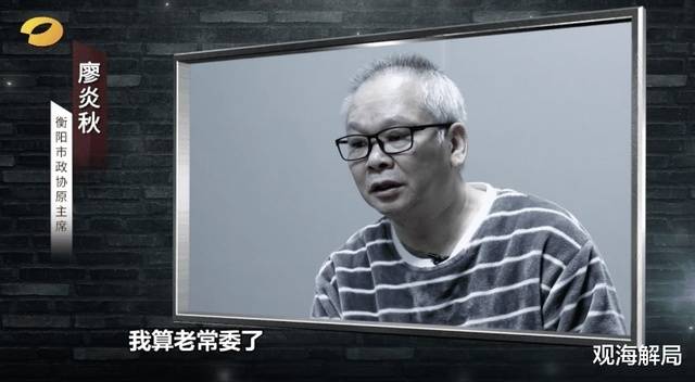 廖炎秋第一次被金钱“震动”是在1992年,他当时任衡阳市驻广州办事处副主任。在一次宴会上,“看到大款坐的是豪华车子,带着的是女秘书,喝的是最好的洋酒,一顿饭下来七八万块钱,那次吃饭对我产生了一种很大的震动。”廖炎秋在片中回忆道。