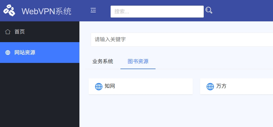 3、使用新版VPN访问知网资源,需要在登陆后,在网站资源中选择图书资源,点击知网等选项进入。直接在电脑中通过域名打开知网等网站则无法使用学校账号下载免费资源。